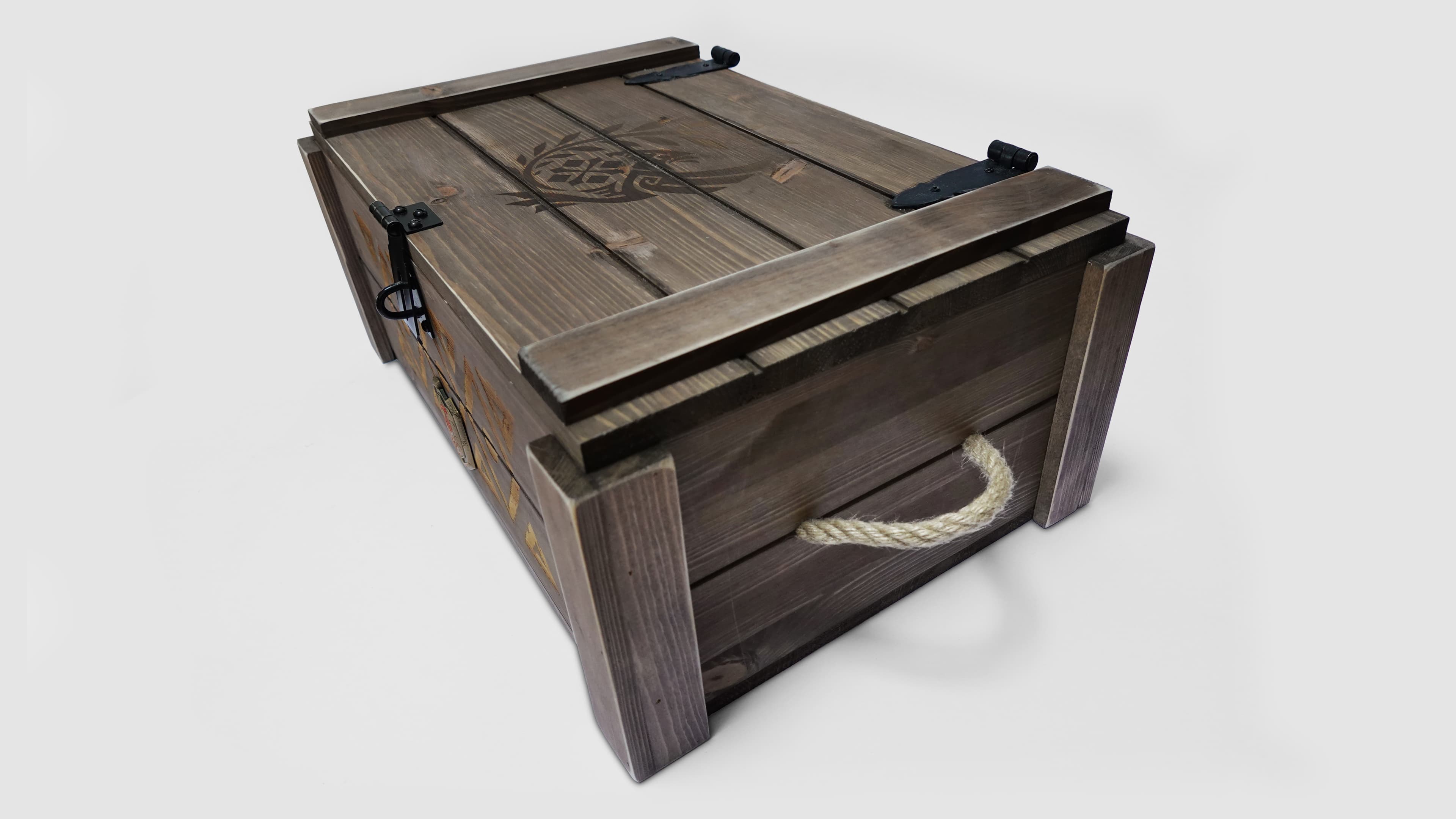 To the front of the wooden chest, a 3D cast antique brass shield (referencing that seen at the Hunter’s base camp) features individual numbered editioning via laser engraving and red enamelling, alongside the laser engraved triangle motif seen on the game’s sand ships. Jute rope handles, black arrow strap steel hinges and wooden struts enhance the utilitarian vibe to create a stunning gameworld-esque delivery method for the kit’s content and a collectable keepsake recipients can use for display/storage.