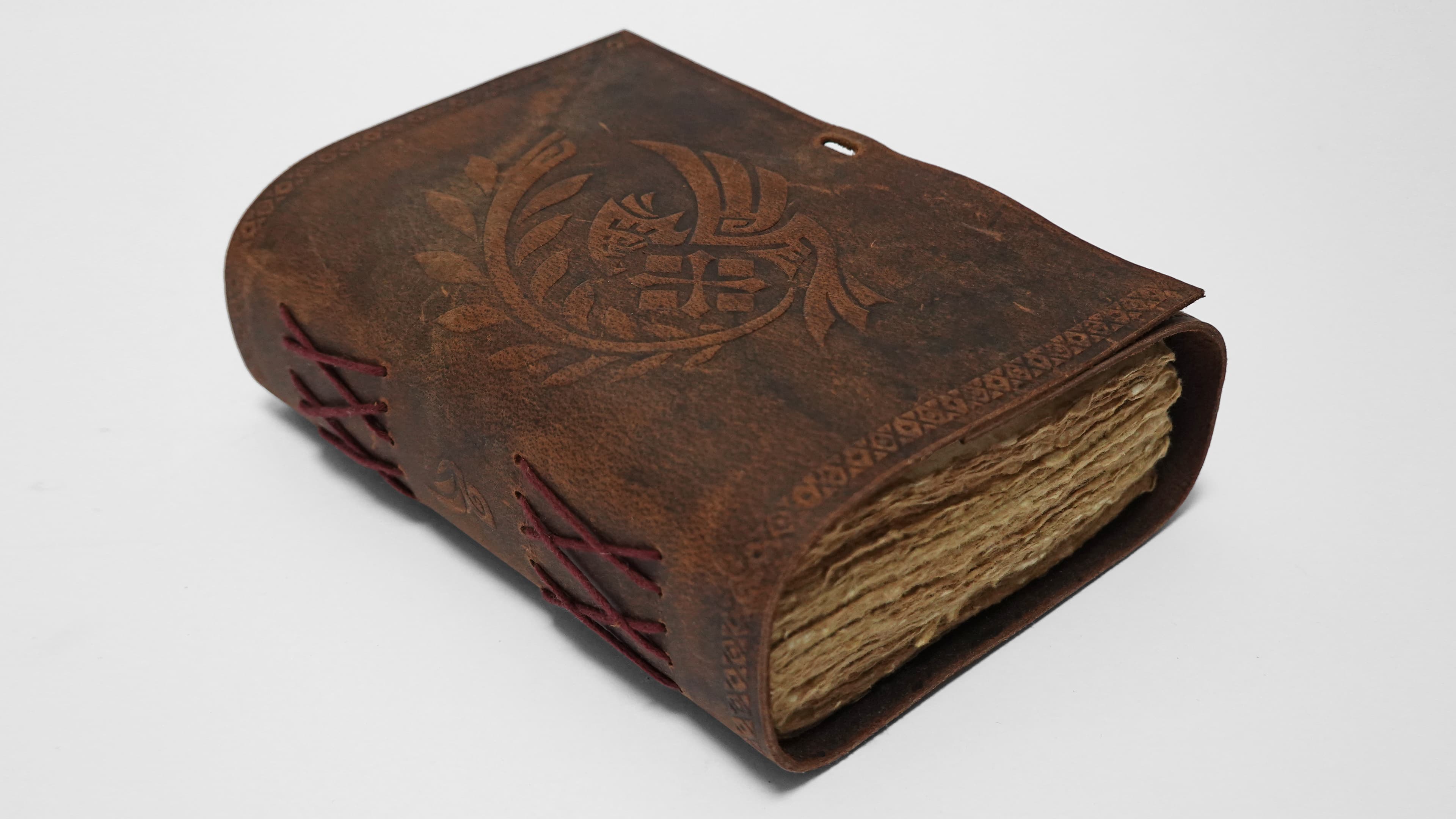 Alongside the bag, sits the Hunter’s notebook, its hand distressed leather “monster hide” cover featuring ornate debossings including the Avis Unit insignia on the spine - and secured with leather tie-straps whilst string bindings on the spine further the aesthetic. The notebook opens to reveal three Guild cards - placed atop 240 pages of handmade deckled paper, sewn into sections. Each Guild card features a painted orange edge with character art and gold-foiled logo to the front and sections of the Arkveld key art printed on “monster hide” effect paper to the rear, which combine to create a triptych.